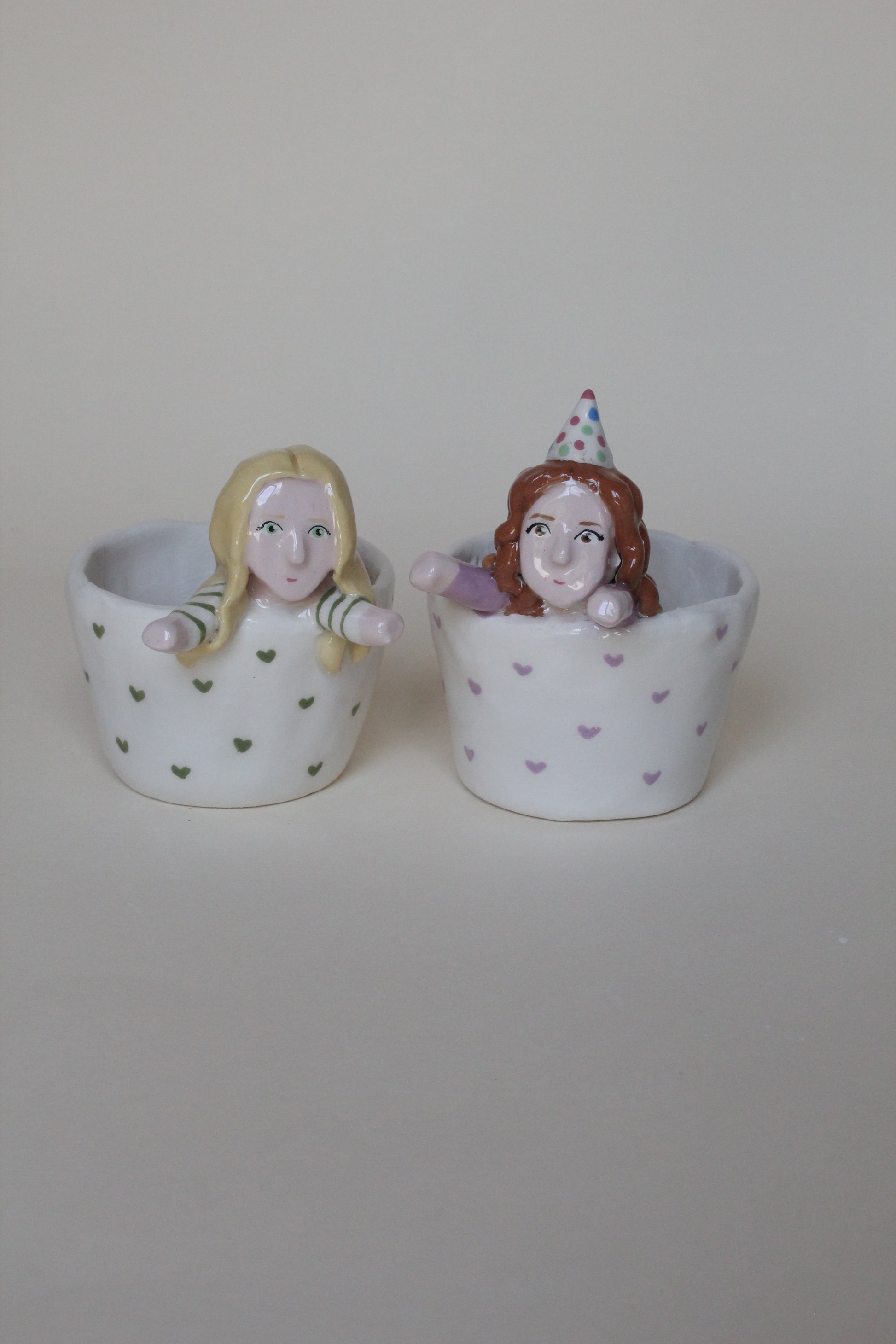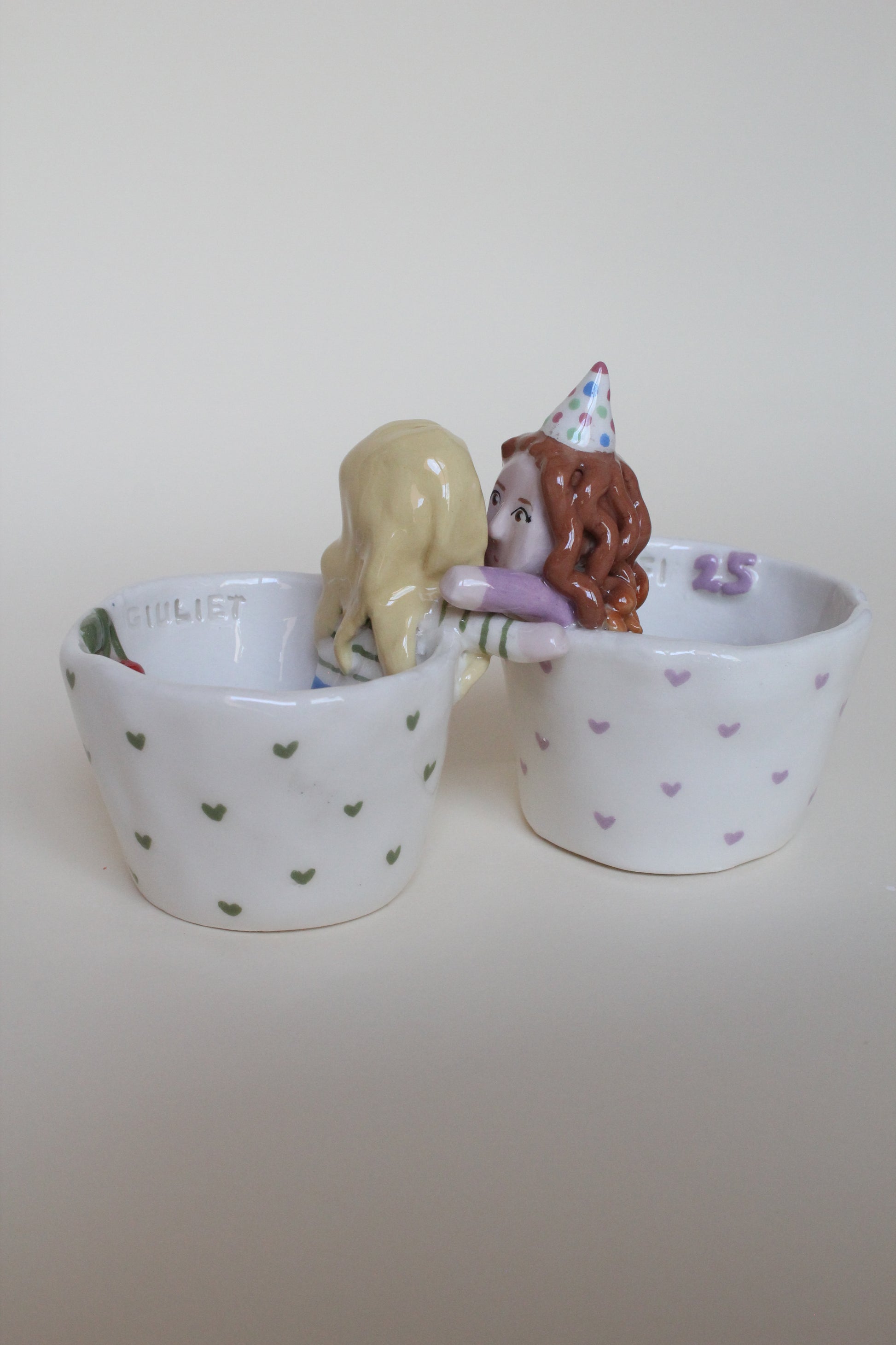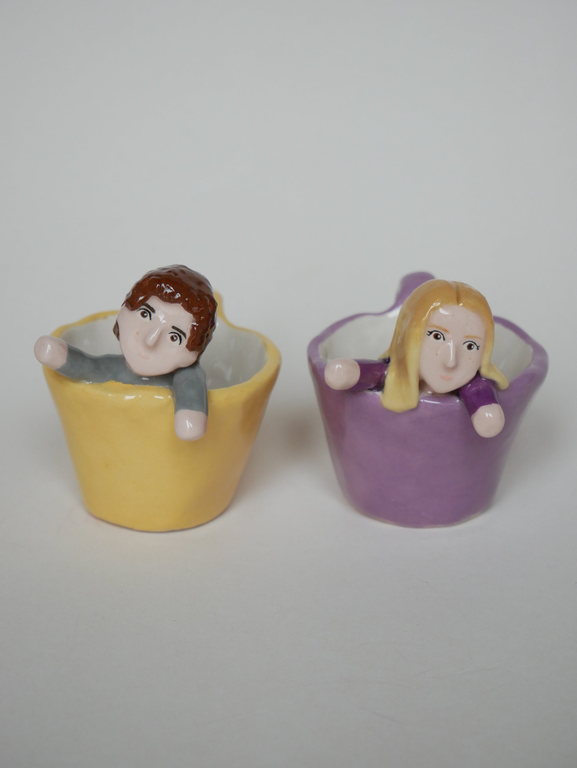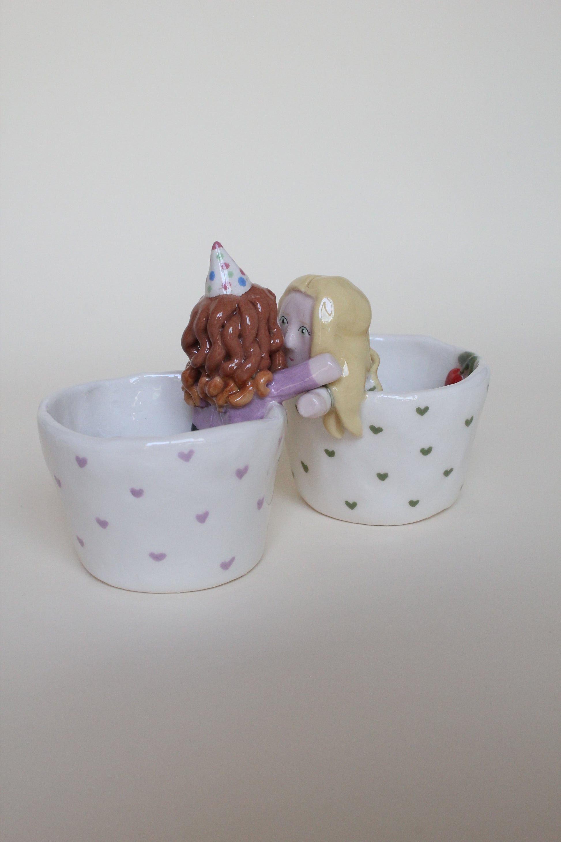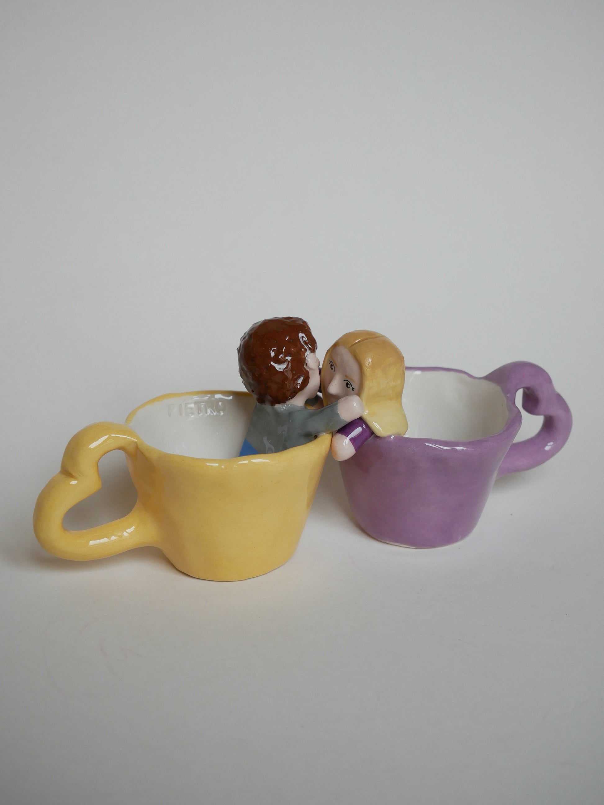 Coppia di tazzine da caffè con Cer-amici personalizzabili, che si uniscono in un abbraccio se avvicinate. Completamente realizzate a mano dalla modellazione alla pittura.